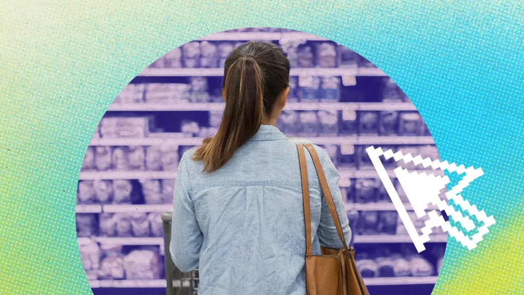Shopper browsing packaged vegetables at a grocery store shelf, illustrating shelf-edge marketing and in-store consumer behavior.